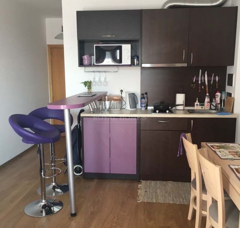 Вторичная недвижимость в Болгарии на пятом этаже комплекса с площадью 52 кв.м.и состоит из прихожей, гостиной комнаты с кухней, спальни, ванной комнаты с туалетом и террасы. Квартира продается с полной меблировкой и бытовой техникой. Имеется кондиционер.