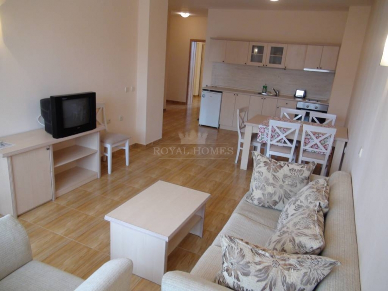 Квартира с двумя спальнями расположена на пятом этаже, площадь 120 м2, полностью меблирована.  Состоит из кухни с гостинной, двух отдельных спален, ванны с туалетом, второго санузла и большого балкона с видом на бассейн, внутрений двор частично на море. Вторичная недвижимость в Болгарии подходит как для летнего отдыха так и для круглогодичного проживания.