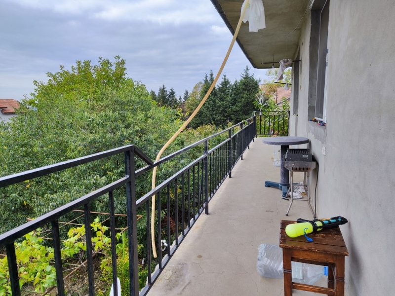 Второй этаж имеет отдельный вход, прихожую, кладовую, просторный салон и три жилые комнаты, кухню и большую панорамную террасу с видом на деревню и зелёные насаждения. Отопление выполнено системой центрального отопления с камином на пеллетах и радиаторами, обеспечивая равномерное тепло во всех помещениях. Система также подаёт горячую воду через встроенный бойлер, что делает дом полностью автономным и готовым для круглогодичного проживания.