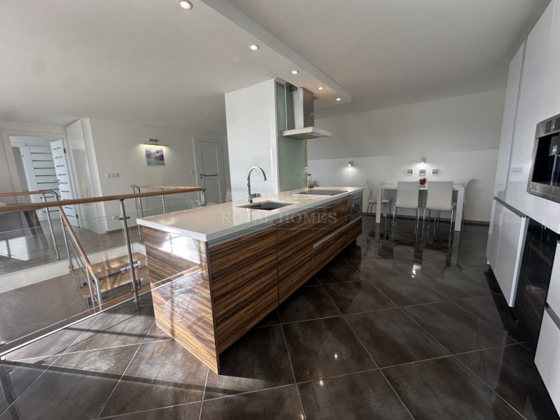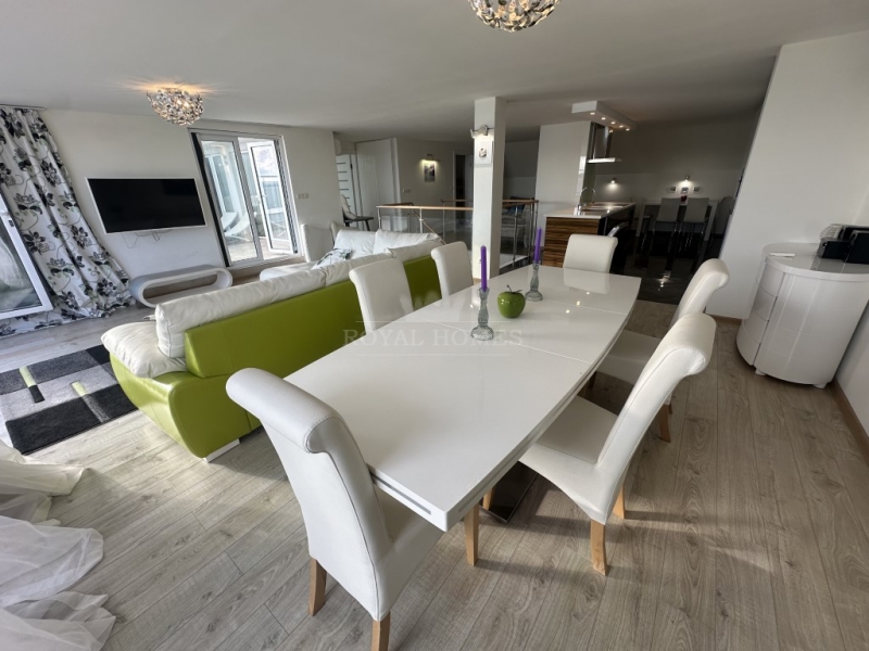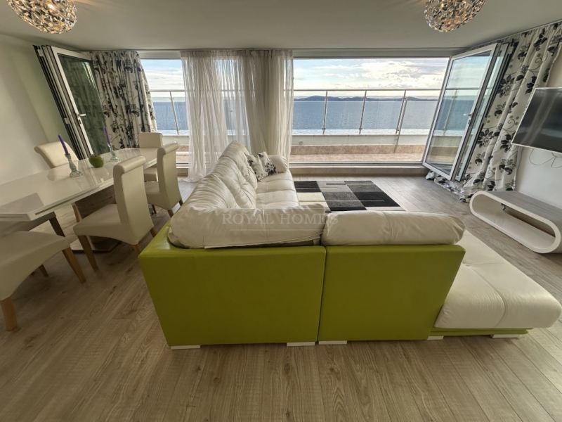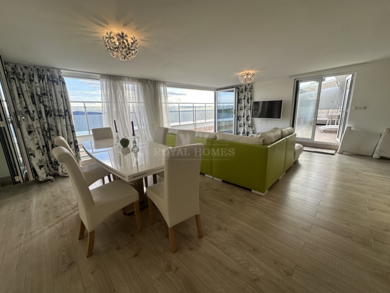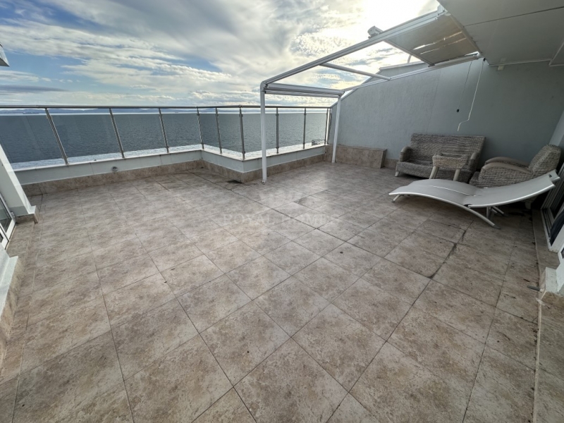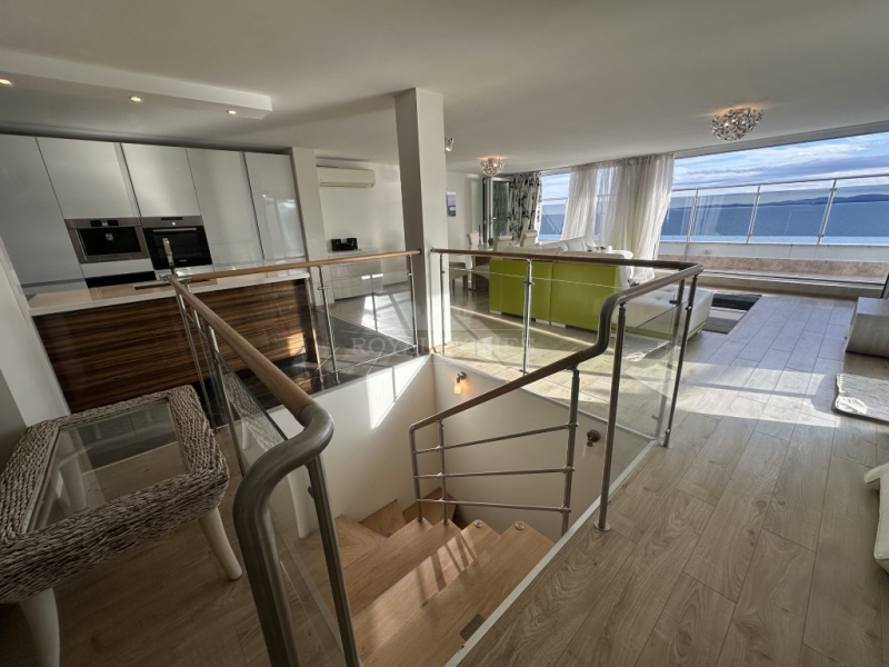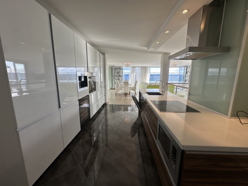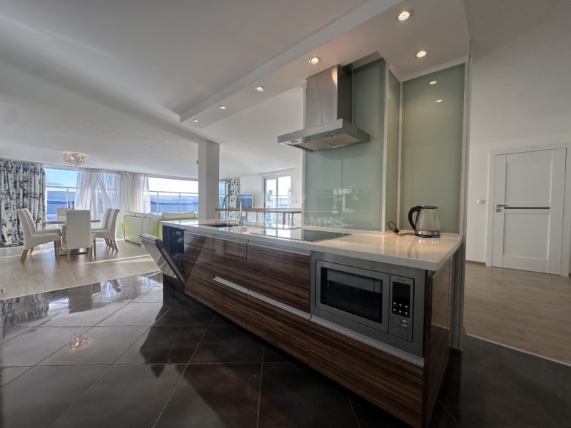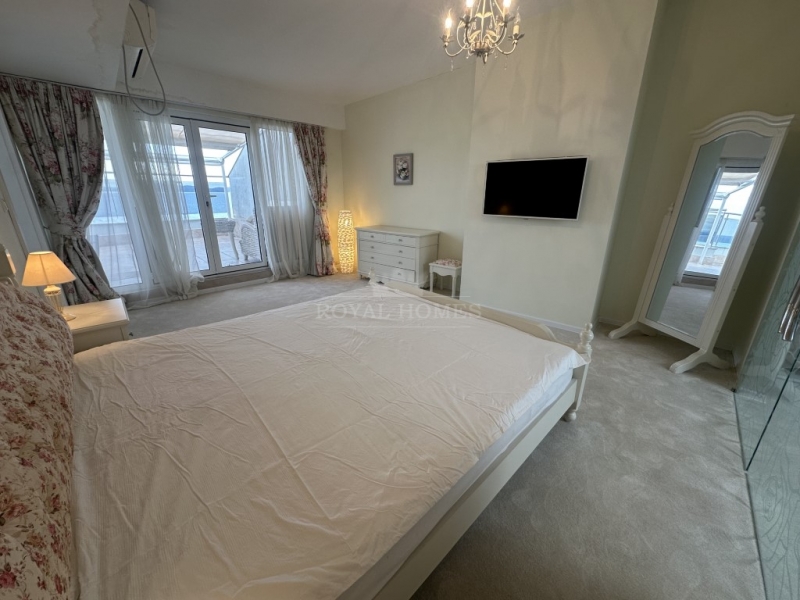 Двухуровневая квартира принадлежит к вторичному рынку элитной недвижимости и находится в безупречном состоянии. Просторная гостиная с панорамными окнами наполняется естественным светом, открывая великолепный фронтальный вид на море. Три отдельные спальни обеспечивают комфортное проживание большой семьи или возможность приёма гостей. Интерьер оформлен в современном стиле: тёплые пастельные оттенки, качественные материалы, изысканные детали отделки и мебель, подобранная с особым вкусом, создают атмосферу роскоши и гармонии.