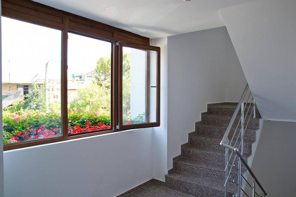 В комплексе есть круглосуточная охрана. На противоположной стороне здания находится бассейн с детской секцией. Сад для отдыха полностью озеленен. Вокруг бассейна отдельная зона с шезлонгами и зонтиками, которые на разположении живущих в здании.В комплексе есть автостоянка для 8-ми автомобилей, которая расположена за пределами огороженной територии комплекса. Степень завершенности - под ключ, с ламинатом, полностью оборудованными ванными комнатами, кондиционерами , осветительными приборами. КУХОННАЯ МЕБЕЛЬ + КУХОННАЯ ТЕХНИКА - за дополнительную оплату.