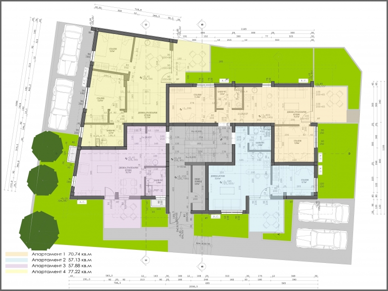 Новостройка состоит из 14 квартир разной планировки. В продаже есть студии, двух- и трехкомнатные квартиры. К квартирам есть и кладовки в подвальном этаже. Дом невысокого строения, всего из 4 этажей. Недорогая недвижимость сдается в готовом виде с отделкой под ключ. Стены покрашены латексной краской, напольное покрытие – плитка и ламинат. Окна пластиковые, немецкие. Подключены все коммуникации – вода, электричество, выводы для интернета и телефона. В доме установлен домофон.